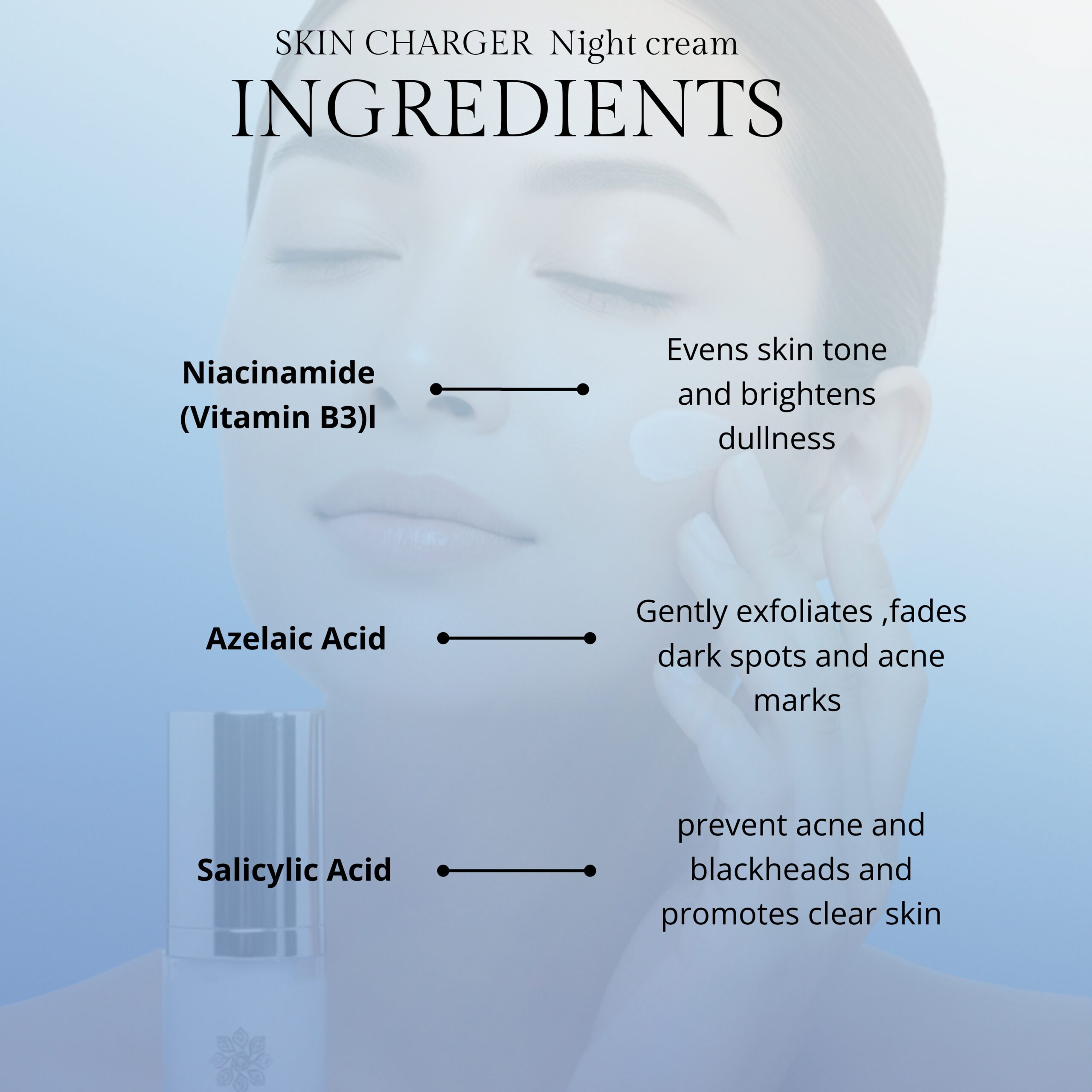 Skincharger Night Cream is an intensive night cream that works while you sleep to restore and replenish your skin’s natural moisture balance. Enriched with ingredients like Glycerin and Salicylic Acid this nourishing formula helps to restore skin’s radiance and improve its overall appearance.