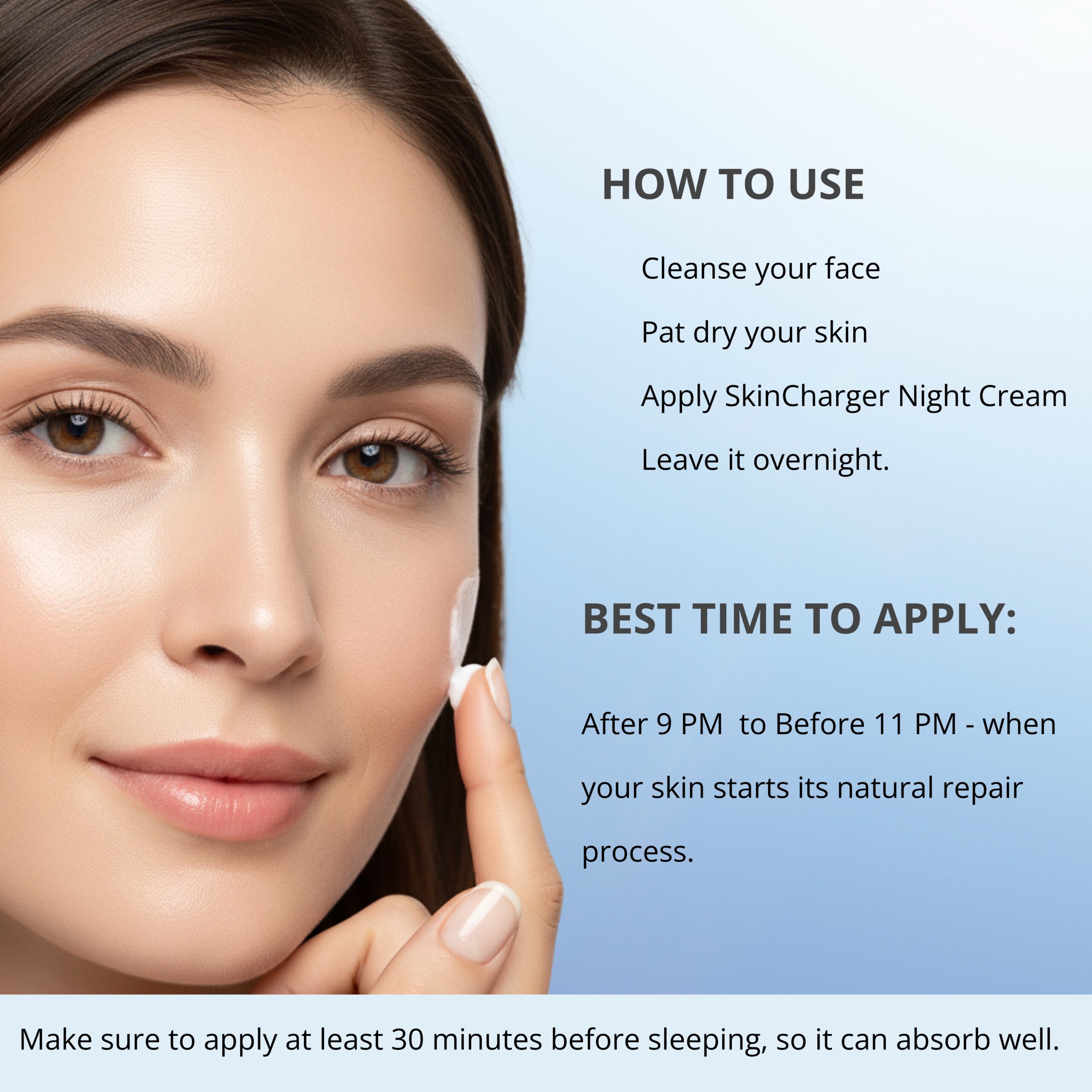 Skincharger Night Cream is a luxurious, multi-functional night cream that helps to revitalize your skin while you sleep. Enriched with hydrating ingredients like glycerin and salicylic acid, this nourishing formula helps restore the skin’s natural moisture balance and improve the overall appearance. The soothing Skincharger Night Cream is a luxurious, intensive moisturizing experience that works while you sleep to rejuvenate and nourish your skin. Enriched with a unique blend of hydrating ingredients such as Glycerin and Salicylic Acid, this deeply nourishing formula helps improve the overall appearance of the skin by restoring moisture balance and giving it a natural glow. The addition of Bisabolol and Gold Seaweed helps soothes inflamed or irritated skin while keeping it hydrated from within. Skincharger Night Cream is paraben-free, peg-free, silicone-free, and phthalate free making it suitable for all types of skins.